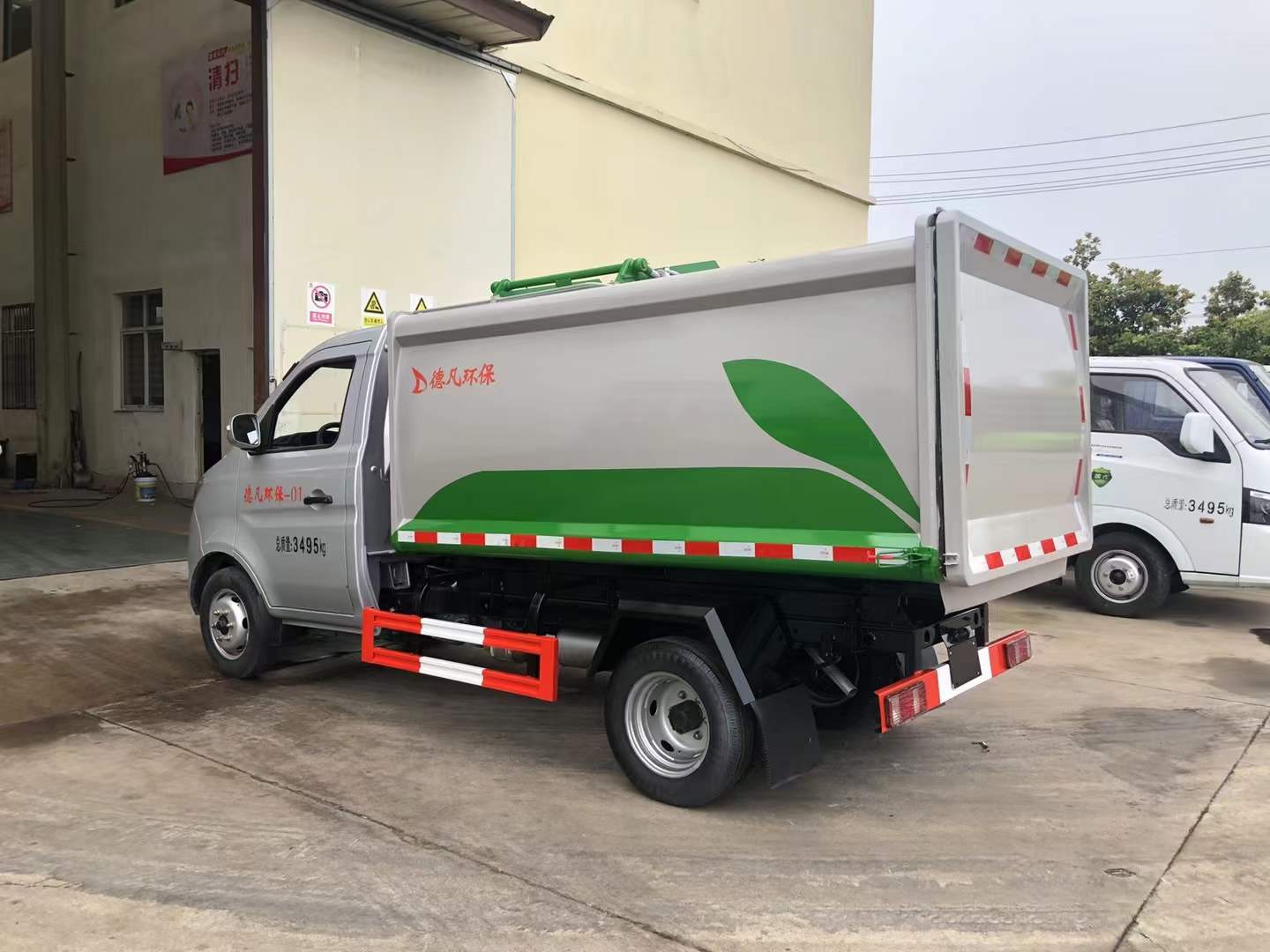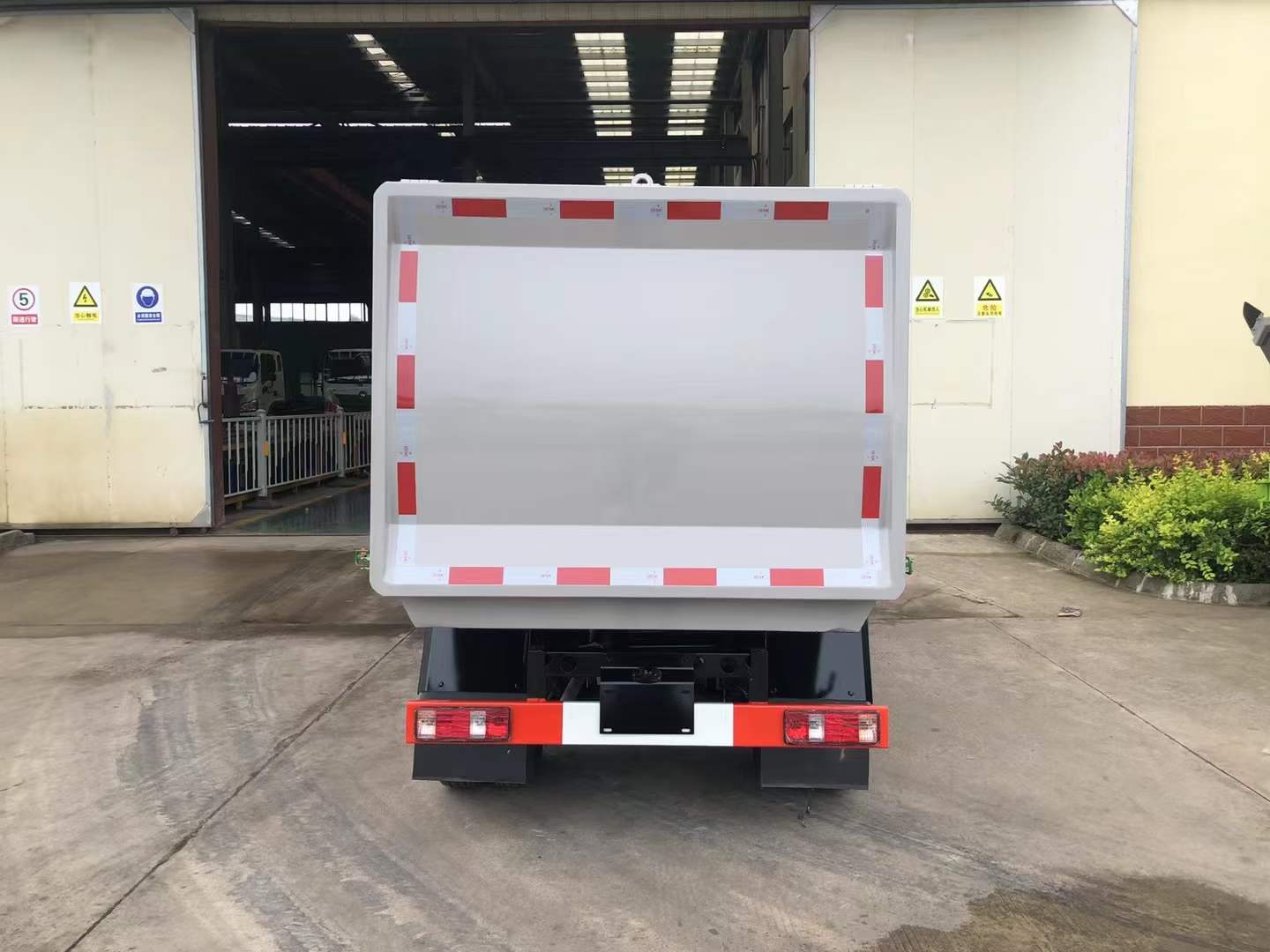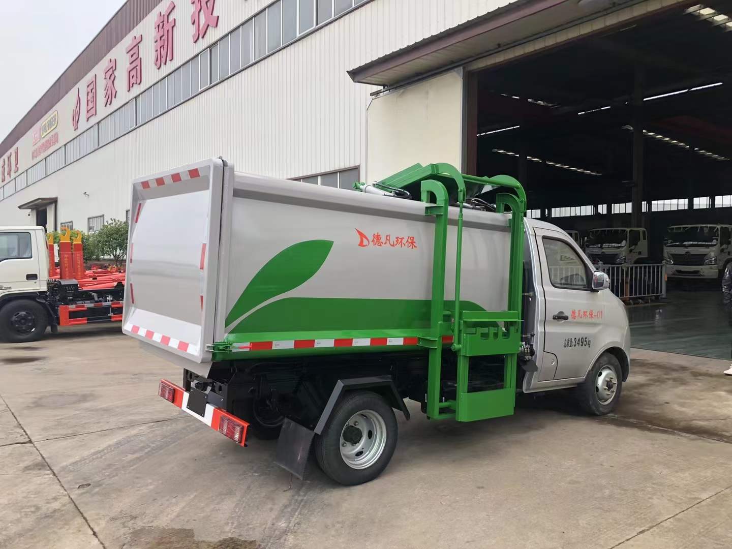車廂由密封式垃圾廂、液壓系統、操作系統組成。一車可對應多個垃圾桶,可自行吊上放下,上下一次工作循環時間≤50S。車廂為自卸式,雙頂小三節油缸,箱體尾部為手動密封蓋,四周安裝密封條,進料口帶液壓膠條。大廂前后及頂部安裝加強筋,防止貨物卸裝與廂體產生裝機,車輛右側安裝提升機及爬梯.